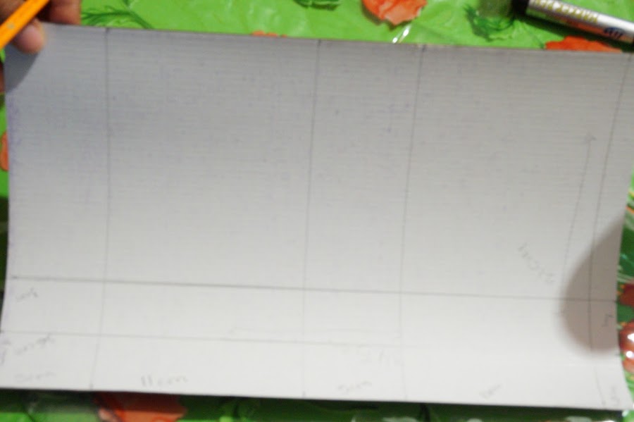 PASOS:1.- En tu rectángulo ya cortado al tamaño indicado, marcarás con un lapíz y con la regla 1.5 cm, de ahí marcas otros 5 cm en el lado más largo, de ahí 11 cm luego otra marca en 5 cm más, otro de 11 cm. marca las líneas a las medidas que te indico. Ahora de forma horizontal marca 3 cm y ha un línea de ahí parte para marcar otros 3.5 cm y hacer otra marca. Te quedará algo así: