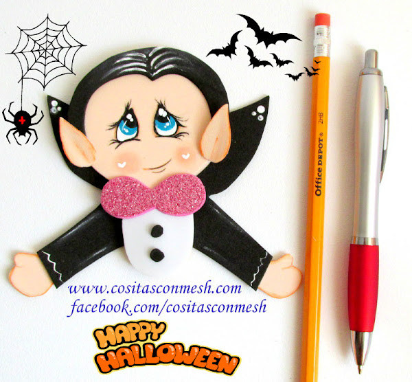 Hola amigas de cositasconmesh.com, como verán ya empezamos con nuestras manualidades para este halloween, y sé que muchas amigas ya empezaron a hacer todo tipo de souvenirs, muchos de ellos serán vendidos para aprovechar estas festividades como también serán para regalar a familiares y amigos. Bueno chicas espero que mi manualidad de hoy les ayude un poquito a darles inspiración en esta temporada de halloween. Les enseñare a hacer al señor vampiro en foami, yo lo use para decorar los lapices o plumas, pero si tu quieres úsalo para decorar bolsitas de dulces, o hacer carteles, coronas, imanes, hay muchas manualidades que podemos hacer con este vampirito. El paso a paso y los moldes te los dejo a continuación, pero no todo queda ahí, al final te dejo los links de 4 manualidades bonitas para hacer en este halloween, no te olvides de compartirlo con tus amigas :).