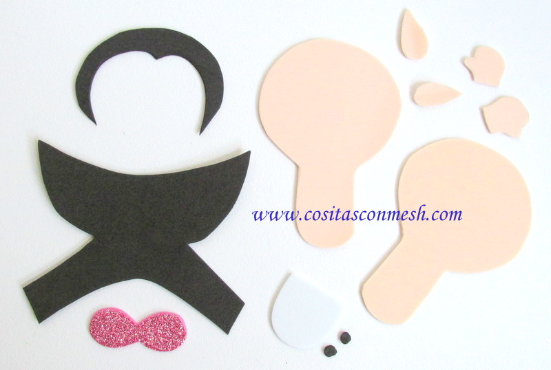 6.-Ahora pegamos sobre el cuello, parte de la camisa y los botones, para terminar, pego encima la corbata michi, el cual lo hice en foami diamantado rosa.