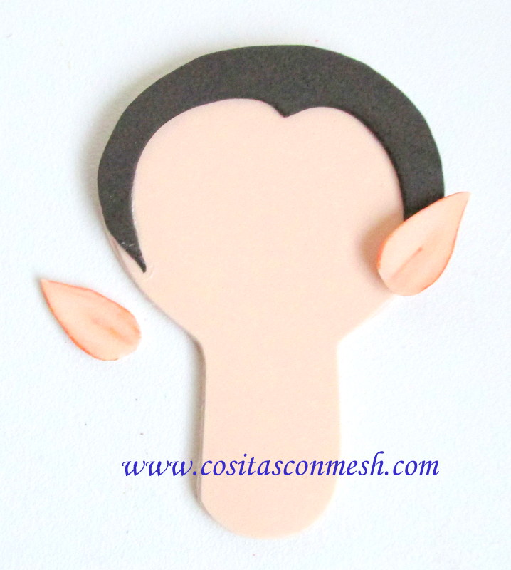 3.-Ya pegado el cabello, pegamos las orejas del vampiro, el cual delinee con plumón naranja.