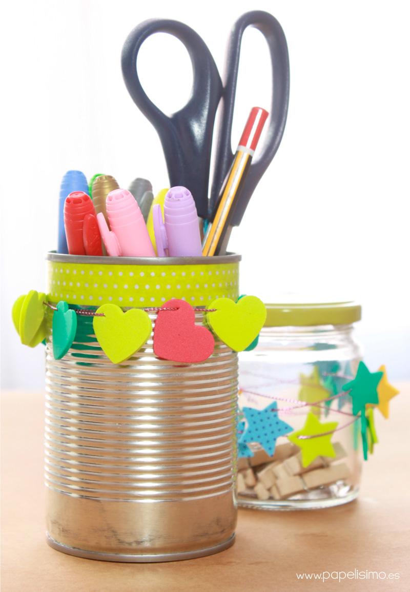 Con la vuelta al cole, llenamos nuestro espacio de lápices, bolígrafos, clips… puedes reciclar tarros y latas para organizar tu material escolar, tendrás lapiceros únicos.