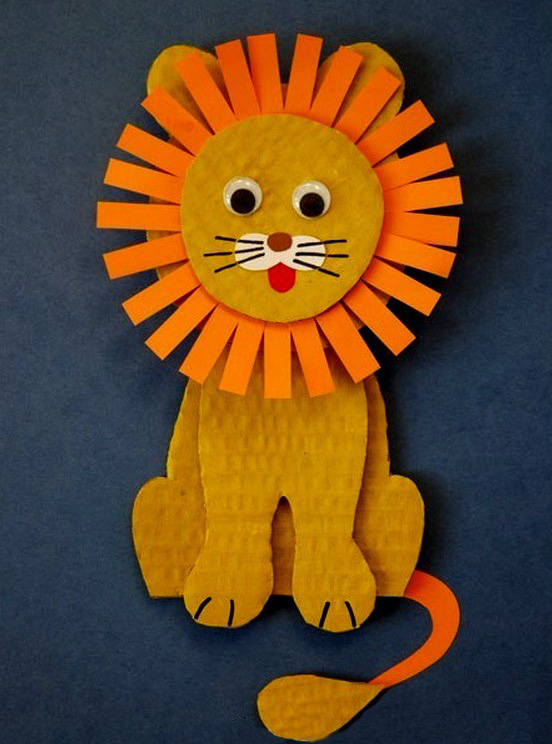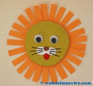 Para hacer la cabeza y la melena del león, cortamos tiras de cartulina naranja y pegamos alrededor del circulo que usaremos para hacer la carita del leon.