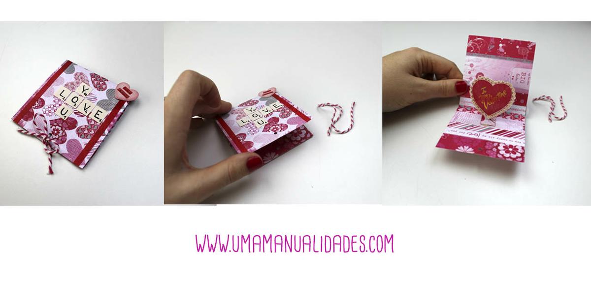 Un poquito más entretenida pero también muy sencilla de realizar, es ésta otra tarjeta que es un poco más grande y nos permite algo de espacio para escribir algunas palabras bonitas en su interior. Tiene un diseño de lo más original y divertido y sin lugar a dudas, es una opción fantástica para hacer una manualidad de San Valentin.