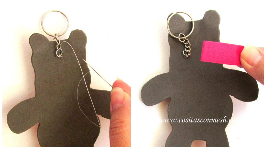 8.-Ahora cose el aro del llavero, (puedes usar aguja y hilo nylon), y solo cose la parte del foami marrón (no vayas a coser la carita )