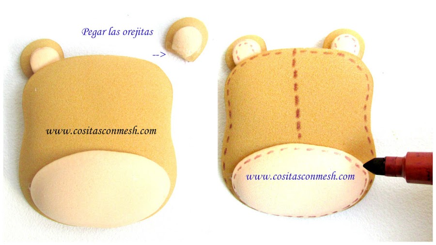 4.-Ahora pegamos los moldes de las orejitas los cuales son 2, para que no se pierda el volumen del hocico, solo debes de poner un poquito de pegamento en todo el contorno, luego ponerlo sobre la carita presionando solo el contorno (si al pegar llegaras a aplastar el hocico, se perderá el volumen del hocico)