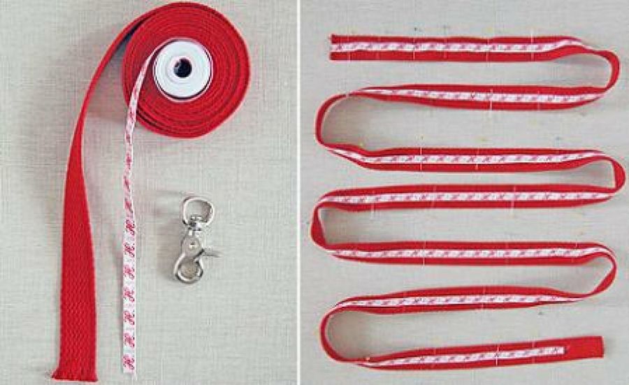 No sólo necesitan los animales ropa y una cama, sino que también tendremos que tener una serie de objetos necesarios para su día a día, desde juguetes hasta correas. De hecho, estas últimas son obligatorias para pasearles por ciertos lugares, así que una gran opción es realizarlas nosotras mismas.La usuaria Eloyzareis ha hecho esta bella manualidad con cinta roja de tres centímetros de ancho, cinta decorativa de un centímetro de ancho, un gancho de metal, una máquina de coser y tijeras. Primero cortamos ambas cintas del mismo tamaño y las unimos con las unimos con costura, haciendo pespuntes rectos en los laterales. Por último, unimos el gancho.