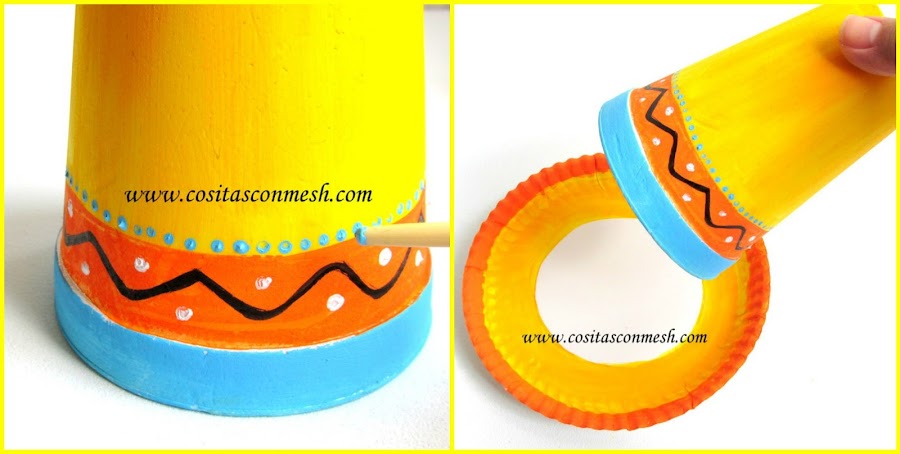 4.-Pinta lineas y puntitos para decorar el vaso, deja secar y procedemos a pegar en el centro de nuestro plato.