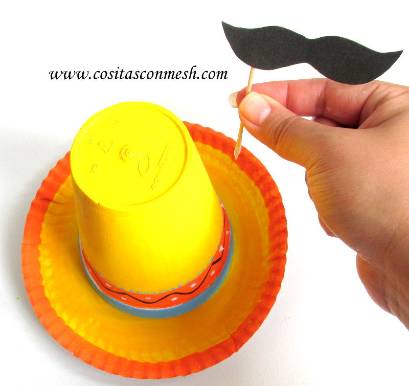 Haz un bigote en foami negro, y pega en el palillo, con silicón pegalo en el sombrero botanero.