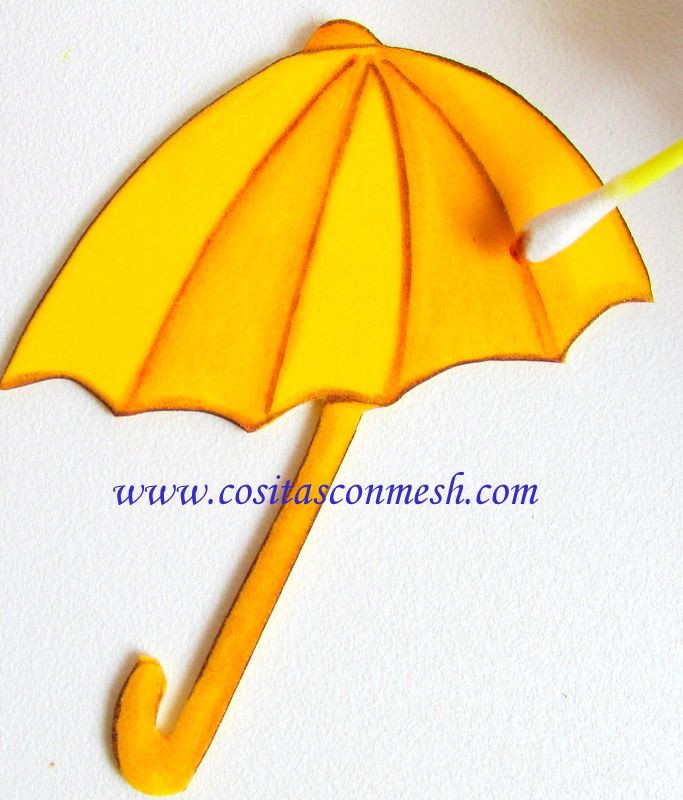 Usa plumón naranja para delinear parte del paraguas, con un hisopo difuminamos el plumón. Luego con plumón marrón pasamos nuevamente.