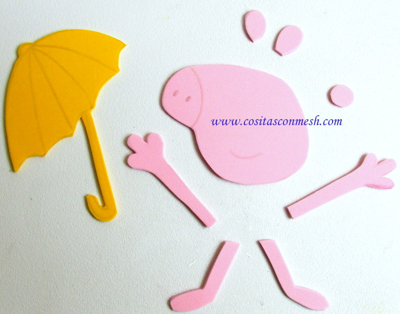 Para la carita carita de peppa pig, pegamos con silicón los ojitos móviles, un circulito que parezca el cachetito rosado, y las orejitas, el paraguas puede ir pegada dentro de la bolsita.