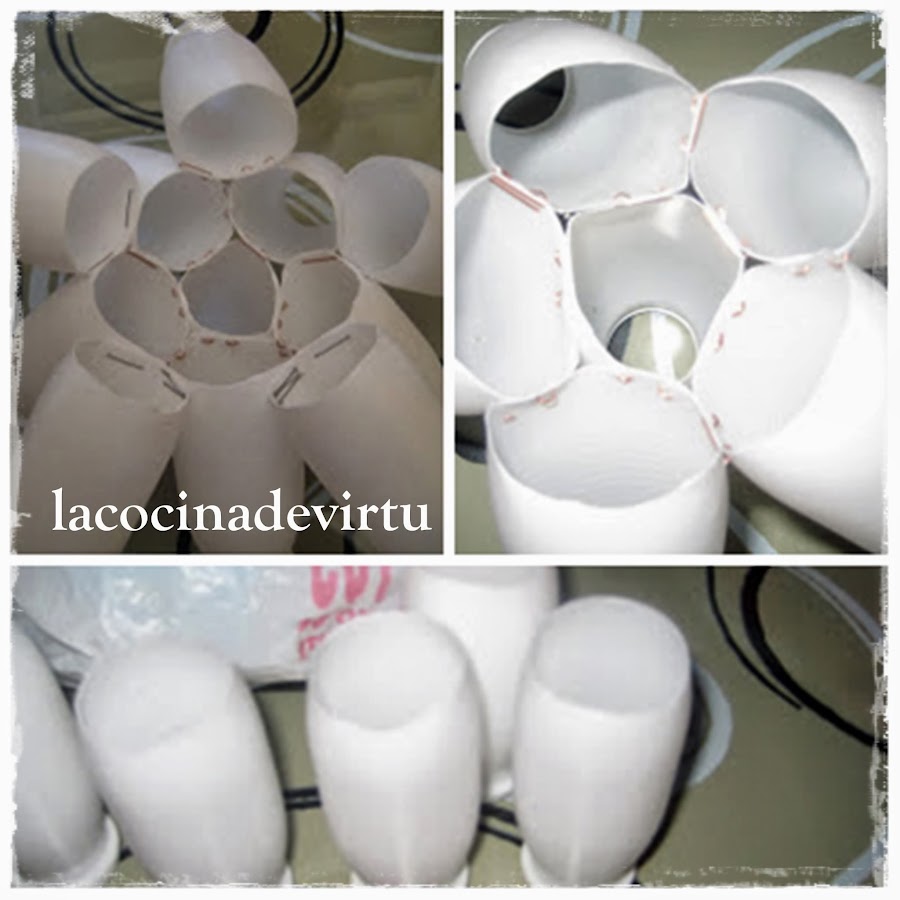 Luego le cortas el culete, luego los vas grapando uno con otro... hasta ir dando la forma de la lampara.