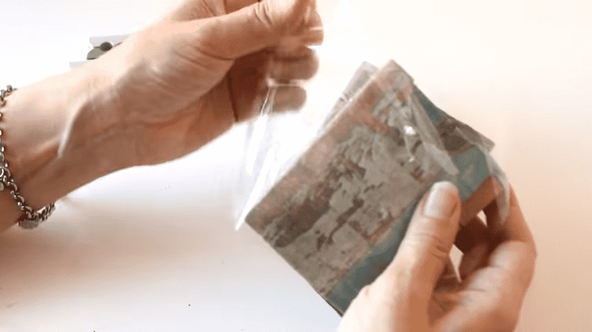 ahora con esta tapita voy a hacer estos medios círculos y acortarlos esto lo hago para que sea más fácil retirar las tarjetascuando se tengamos todos forrados voy a colocar una bolsita o cualquier plástico para proteger el papel