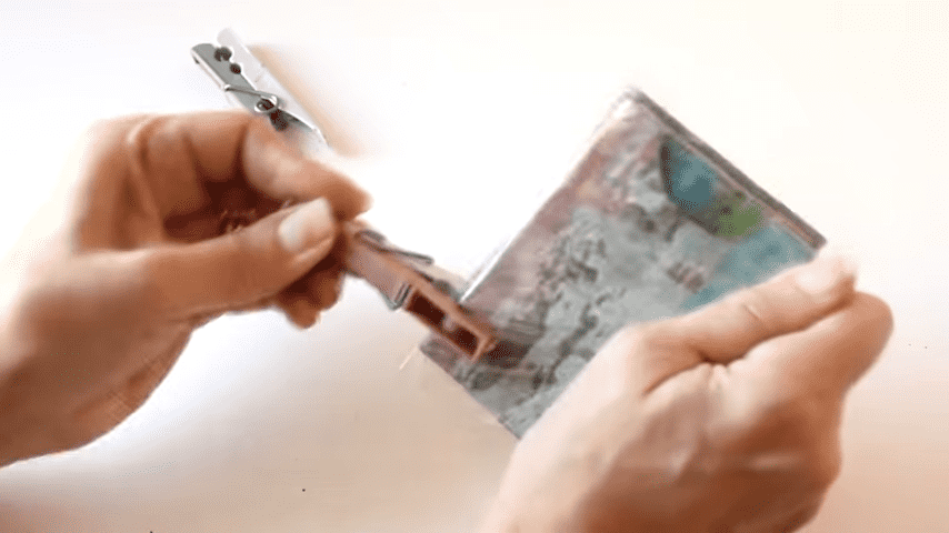 voy a poner estos broches los voy a pegar todos juntos con silicona o podría hacer cualquier otro pegamento fuerte y los voy a dejar secar muy bien, para que los broches no marquen el cartón cada tanto los tenemos que ir cambiando de lugar, cuando la silicona se haya secado van a quedar unidos como se aprecia en la imagenpara hacer el estuche voy a usar este cartón en el que venía envuelta una camisa lo que voy a hacer ahora es medir el ancho que es de 8 centímetros lo voy a pasar al cartón de esta manera y a recortar toda esta tira