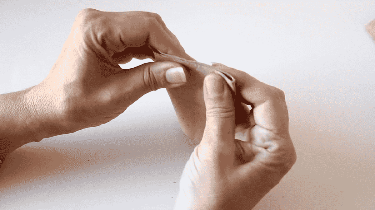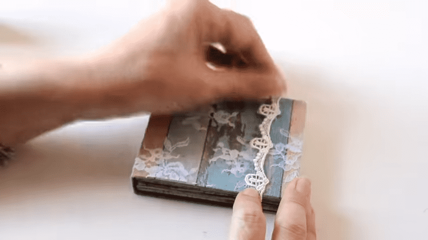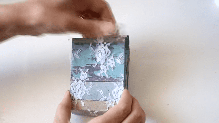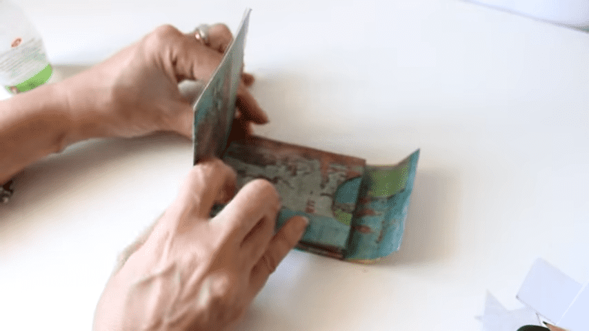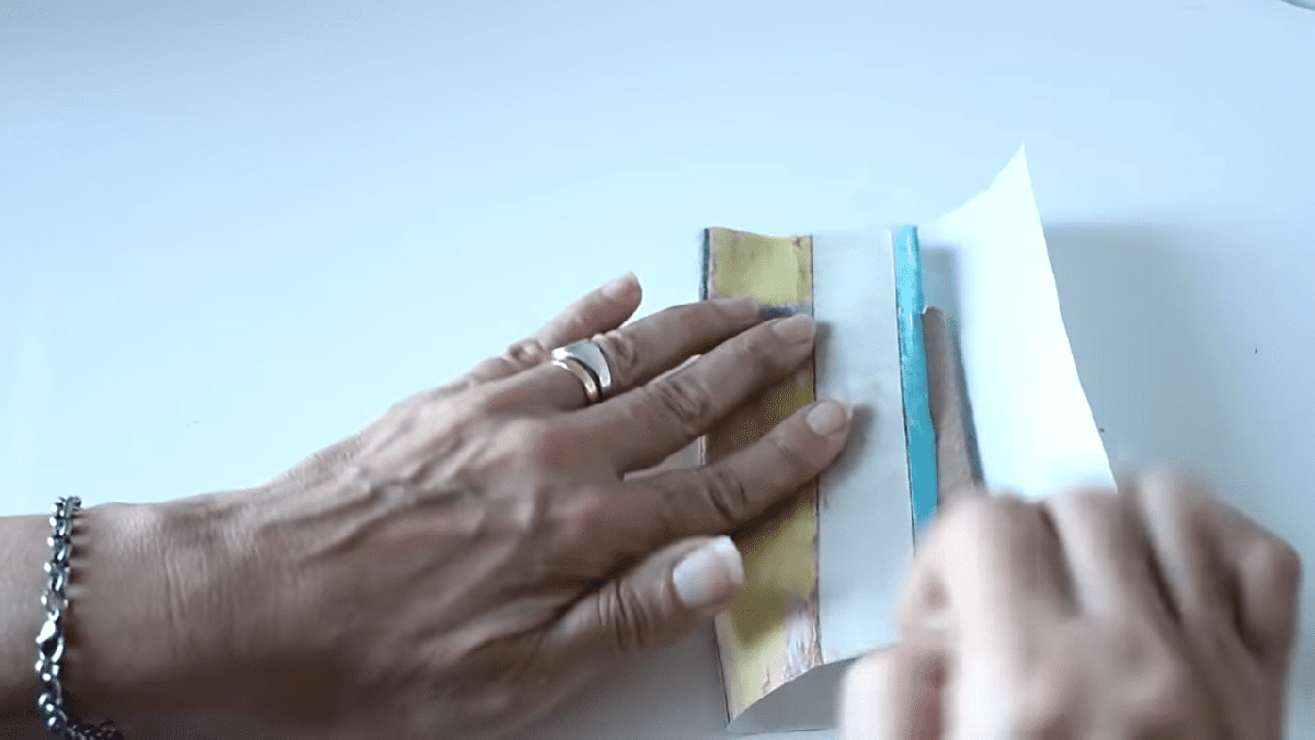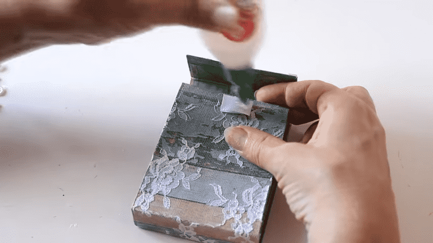 y cuando el pegamento todavía esté húmedo lo vamos a plegar van a notar que el papel tiende a quebrarse lo que no sucedería si usamos tela pero eso no se va a notar cuando le agreguemos el tul bordado por encimacon el mismo papel voy a forrar el interior de este modo y también voy a plegar con la regla