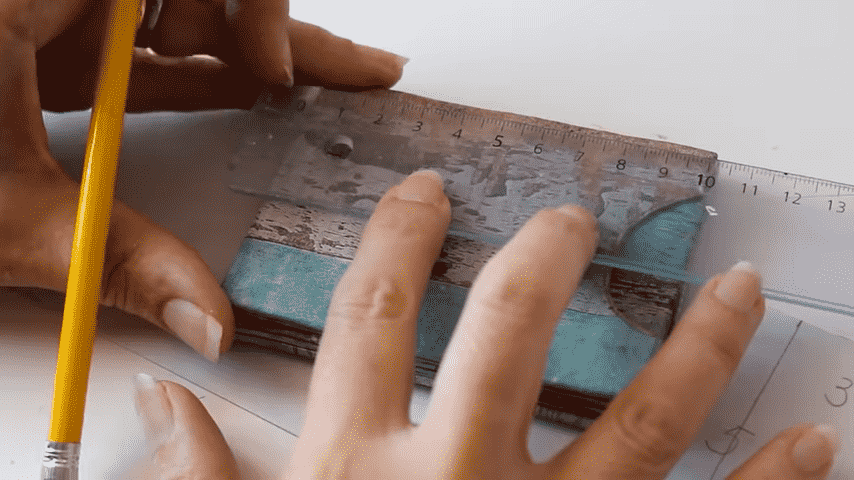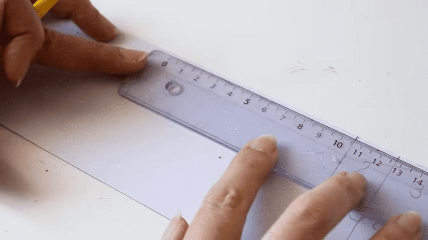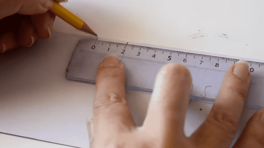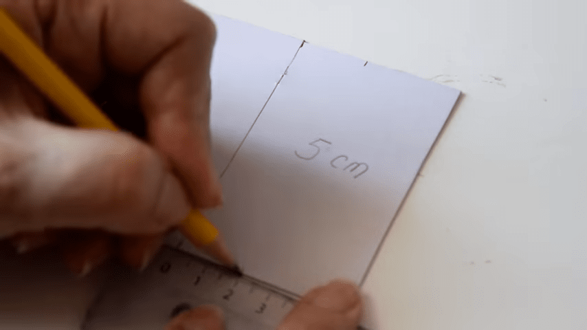 para hacer la solapa voy a marcar a los 5 cm y después en ese espacio voy a hacer una división a 3 cm del bordeme van a quedar entonces dos partes una de dos centímetros y otra de tres ahora voy a medir el largo que es de 10 cm pero le voy a agregar medio cm más