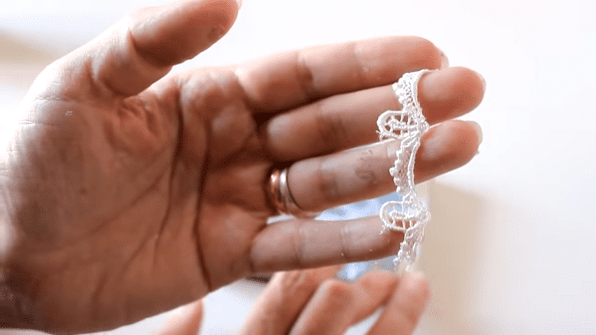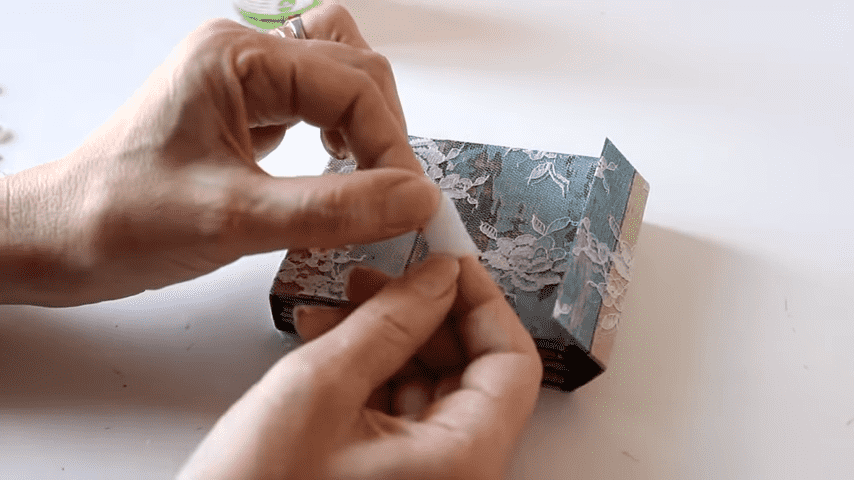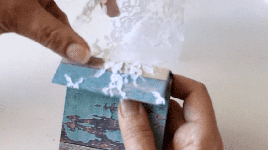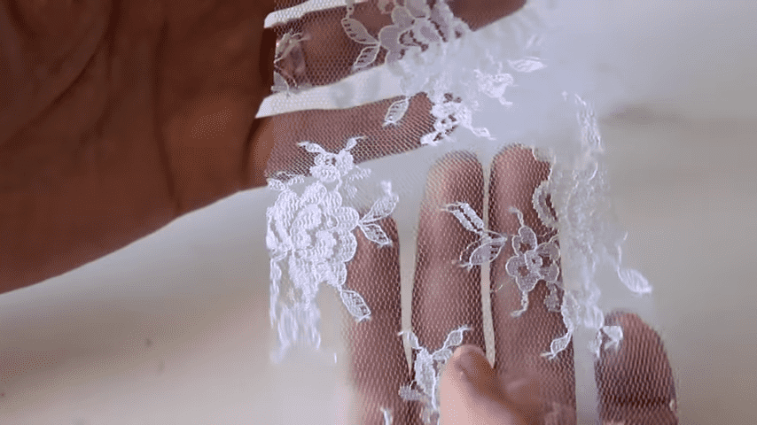 este es el recorte de tul bordado que voy a utilizar para pegar lo voy a pasar con la blanca con el pincel de esta manera y lo voy a ir aplicando