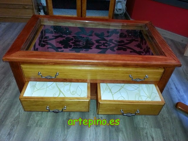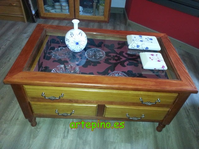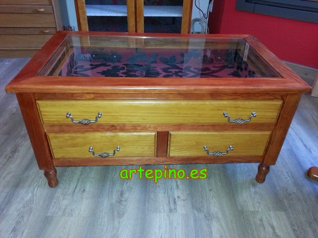 Frente al mueble hay una mesita de centro con cajones, realizada a juego: