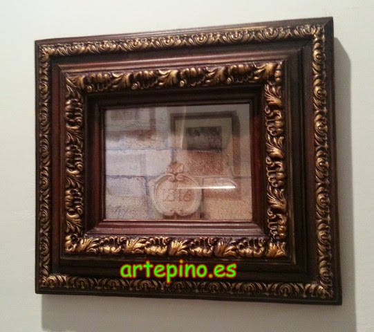 En esa misma pared hay colgados 2 cuadros. El primero lleva la foto del escudo de la vivienda, esta puesta en un marco de resina pintado en nogal y patinado en oro: