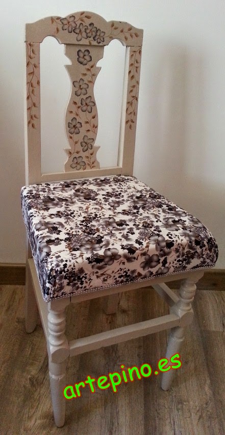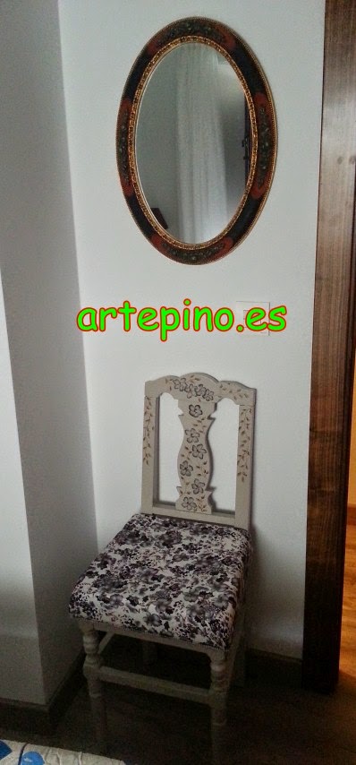 Rematando ya el ultimo rincón de este dormitorio, tenemos esta silla restaurada pero manteniendo sus desperfectos, para que se siga apreciando su antigüedad. Está pintada en un color piedra con unas flores imitando al estampado de la tela que escogimos para hacer el asiento.