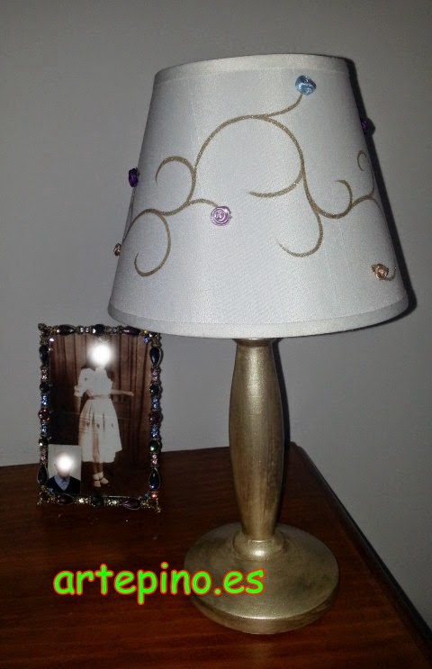 La lámpara lleva unas pequeñas flores de cinta, con los colores a juego del marco pequeño que está al lado: