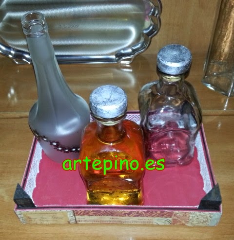 Una original bandeja, que esta hecha con una caja de fresas reciclada y con la técnica del SCRAP en la cual están estas botellitas de licor, también pintadas: