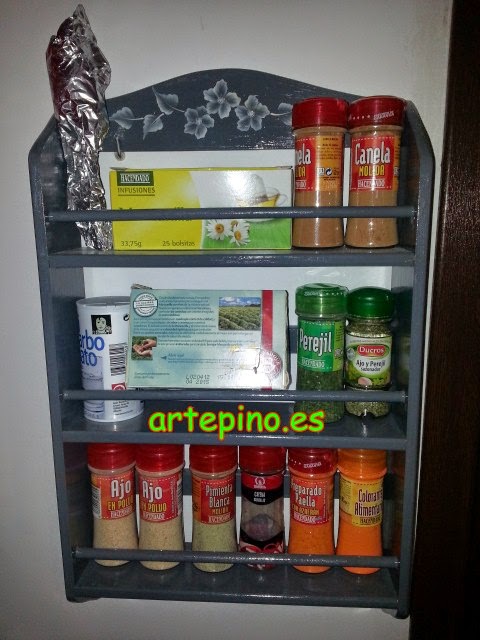 Y este bonito especiero, pintado en gris oscuro y con unas florecitas en blanco aguado:
