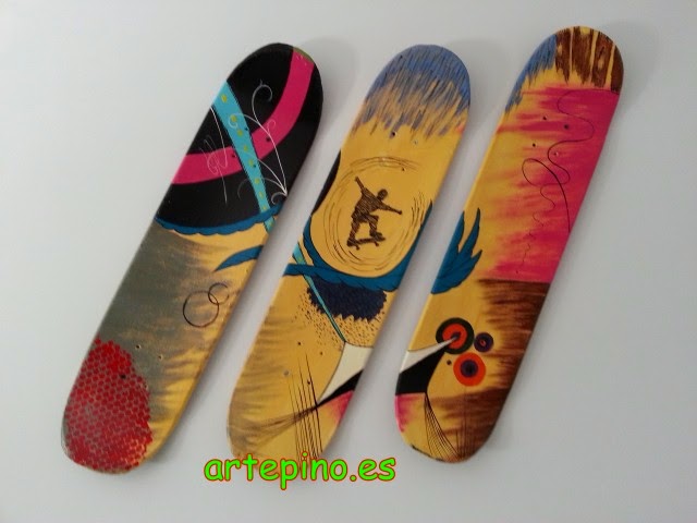 Y en la pared encima de la cama, tenemos este cuadro compuesto por tres patinetes reciclados y que le dan un toque muy juvenil a la habitación: