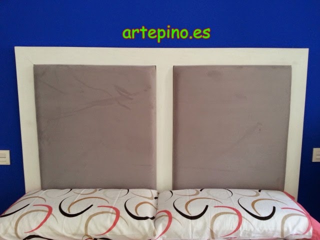El cabecero esta hecho en blanco, con dos piezas que sobresalen las cuales tapizamos con una piel vuelta en color gris plata: