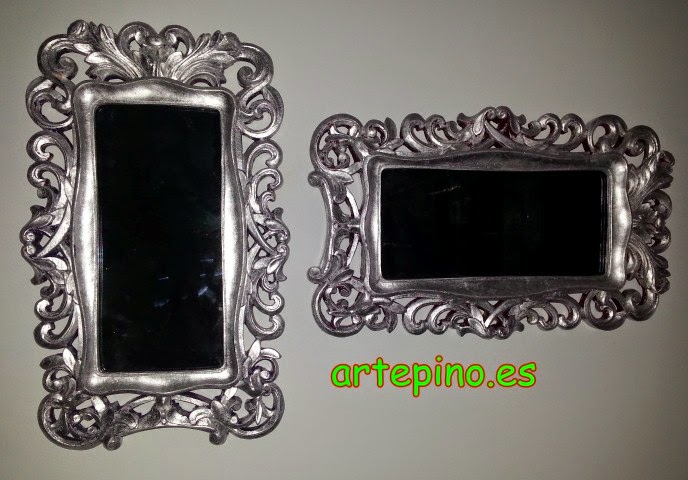 En la pared frente al lavabo, tenemos estos dos marcos de resina con espejo envejecido, que están pintados en plata: