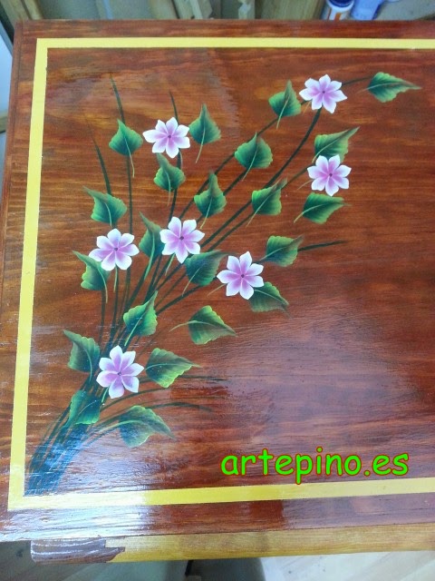 Lo primero que os enseño va a ser el mueble de la televisión, el cual está pintado en dos tonos diferentes de tinte. La estructura está en un tinte avellana y las puertas en un tono pino, por dentro está forrado con papeles de empapelar, los tiradores en forma de rejilla le dan un toque muy bonito, en la tapa están pintadas unos ramitos de flores enmarcados en una linea color mostaza: