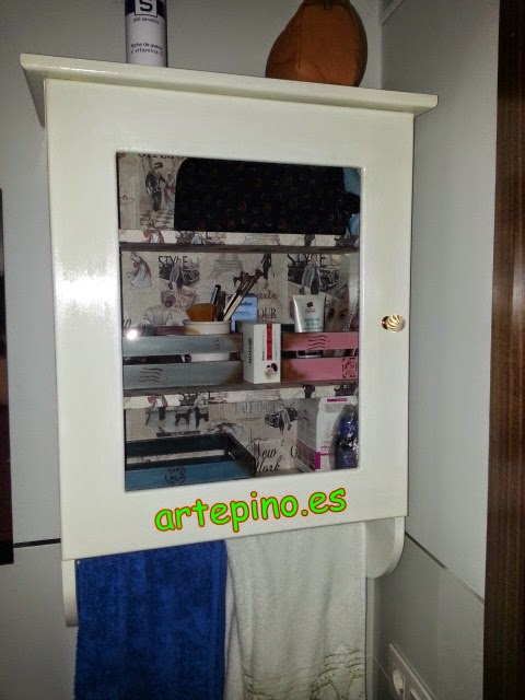 El otro acceso de ese pasillo, nos lleva al cuarto de baño en el cual tenemos este mueble toallero, lacado en blanco y forrado por dentro con papel, en el interior tenemos cajas también realizadas con técnicas de SCRAP, aunque se me olvidó hacerlas foto, jejeje