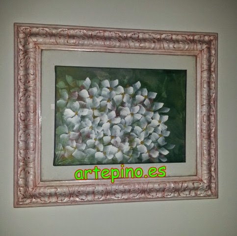 Y en otra pared tenemos este cuadro muy del estilo al anterior, con una morco de resina pintado en blanco y patinado en granate que lleva un cuadro interior puesto sobre un cristal con unas flores pintadas: