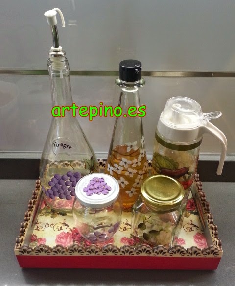 En la cocina, para tener a mano todo lo necesario para cocinar, está esta bonita bandeja y los tarros y botellas tienen un detalle pintado para darles un poco de color: