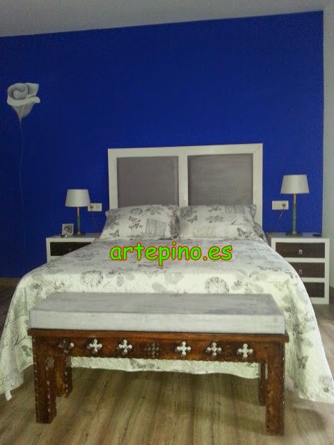 El cabecero de aspas y las mesillas, también están hechos en color avellana: