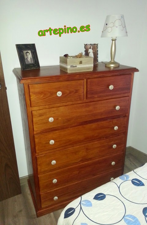 Primero veremos este pequeño dormitorio, es una linea clásica. Al entrar tenemos esta bonita cómoda en color avellana y con unos tiradores de porcelana con una flor:
