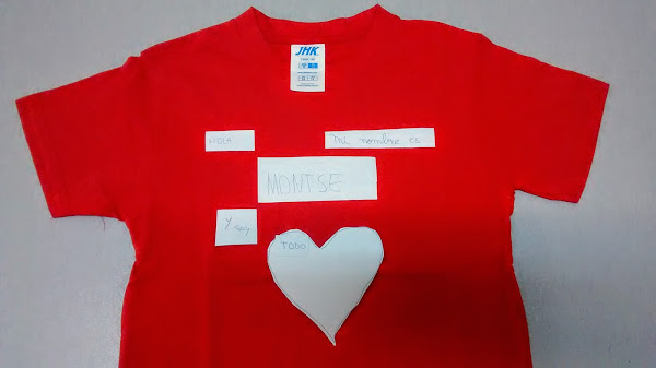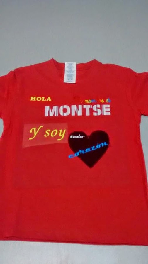 En la foto ya podéis apreciar que la tela que recortamos para el nombre está perfectamente firme en la camiseta; así como el vinilo amarillo que utilizamos para poner HOLA.