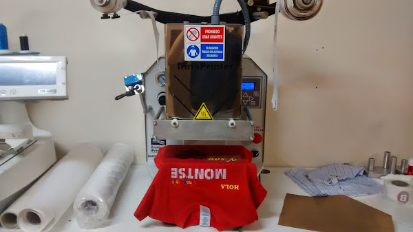 Esta máquina realmente es una estampadora en seco. Puede hacer grandes series en pocas horas y el acabado es asombroso, no utiliza tintas de serigrafía por lo que no es tóxico para los trabajadores. Aguanta lavados en autoclave, a 140º, así que puede usarse en ropa de quirófano, no se borra y se puede usar segundos después de estampar la prenda, no hace falta secarla. Una maravilla de la técnica que sólo tenemos nosotros en todo Ciudad Real.