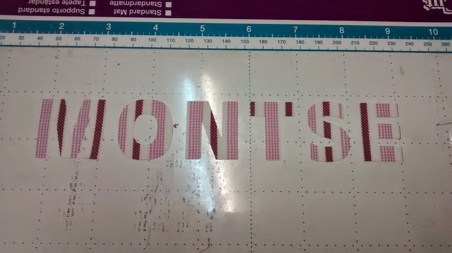 Pues a partir de aquí comenzamos a trabajar con todas nuestras máquinas. Comenzamos utilizando nuestro plotter de corte para recortar los vinilos correspondientes a HOLA y Y SOY; también recortamos la tela que formará el nombre de MONTSE y el corazón de fieltro.