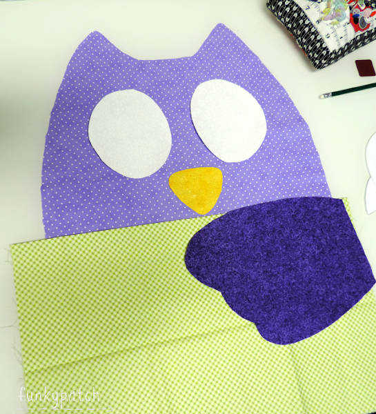 En este proyecto ya es reconocible el estilo Funkypatch, verdad? La clienta eligió las telas moradas y le encantó como las combiné con la tela verde del bolsillo y la celeste de los ojos.
