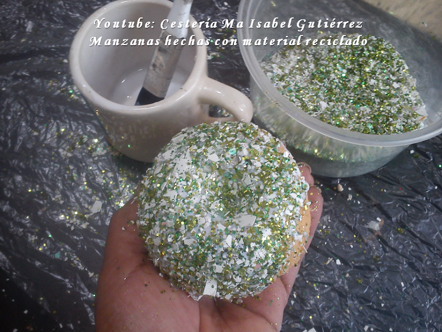 Ya que está bastante seca la pieza, la cubrimos con pegamento o cola blanca y forramos con una mezcla de cascarones de huevos molidos y diamantina del color de tu gusto. (los cascarones se preparan de la siguiente manera: dejamos remojando los cascarones en agua con jabón y unas gotas de cloro, por aproximadamente una hora, luego, quitamos la tela interna, dejamos secar y trituramos lo mas que podamos con algún objeto pesado)... Finalmente, para que no se despegue la diamantina, cubrimos con una capa generosa de barniz transparente o acetato...