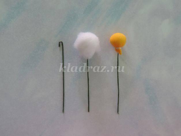 Ahora hacemos el centro. Acomodamos en un extremo del alambre (que será el tallo de la manzanilla) una bolita de algodón y la forramos con la tela amarilla (la mejor tela para esto es el algodón de polos).