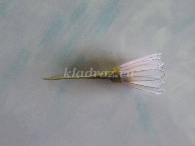 Cubrimos la estructura de alambre con la tela de medias de nylon, estiramos y fijamos la tela con un hilo en la parte inferior del pétalo.