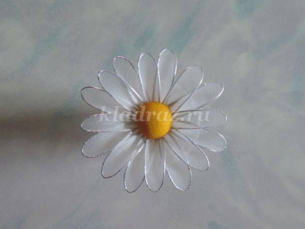 Como siempre primero elaboramos la carcasa de alambre, usando un objeto redondo (un tubo, por ejemplo). Luego aplastamos el círculo para darle la forma del óvalo parecido al pétalo de manzanilla.