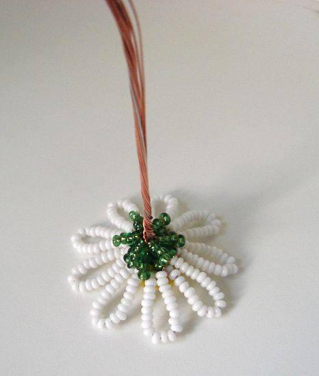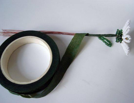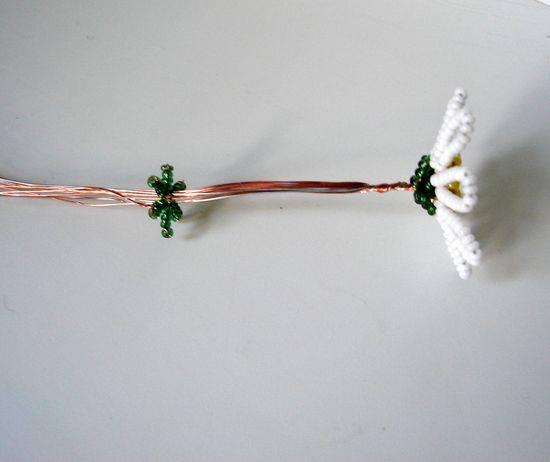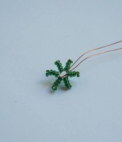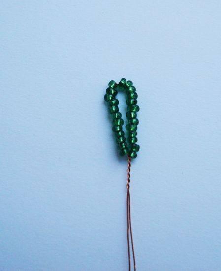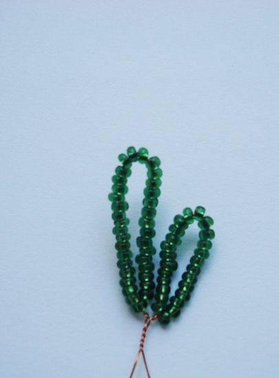 Las hojas se hacen del mismo alambre y de chaquiras de color verde.