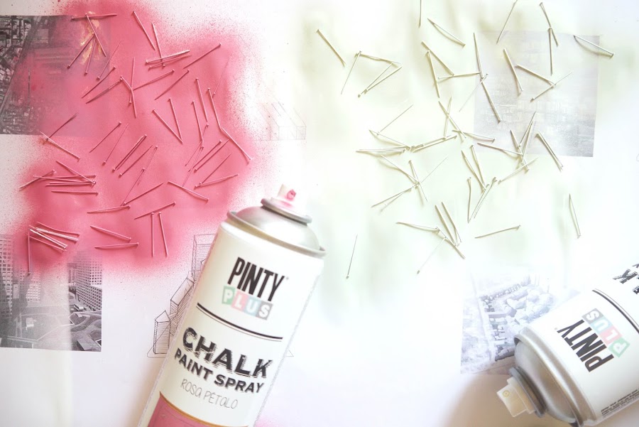 Mientras esperas que se seque el título, coge algunos alfileres y sepáralos en dos montones. Píntalos con sprays de dos colores diferentes. Nos servirán para distinguir los sitios en los que hemos estado y a los que queremos ir.