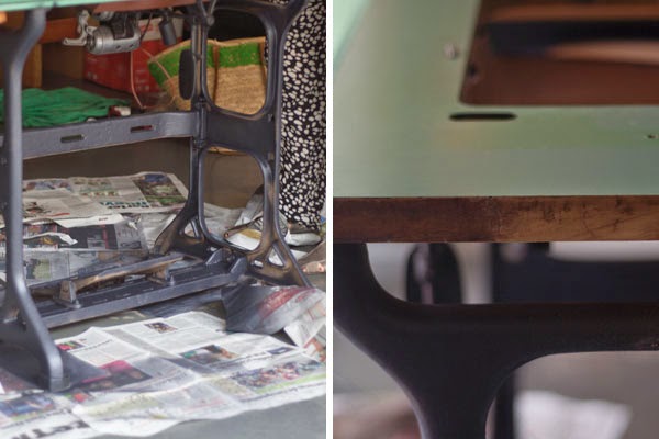 El pie de la mesa es de hierro y estaba perfecto. Lo desmonté del todo y lo pinté con pintura en aerosol de la que imita el hierro forjado. Tuve que darle un par de capas para que cubriera bien y gasté dos aerosoles enteros, para que os hagáis una idea.