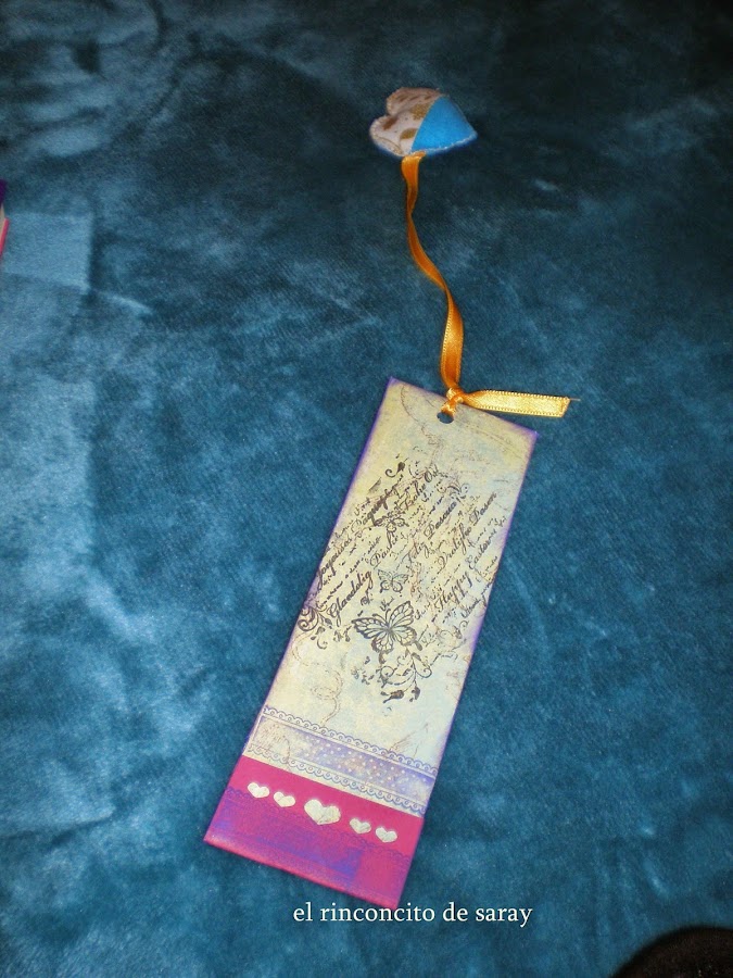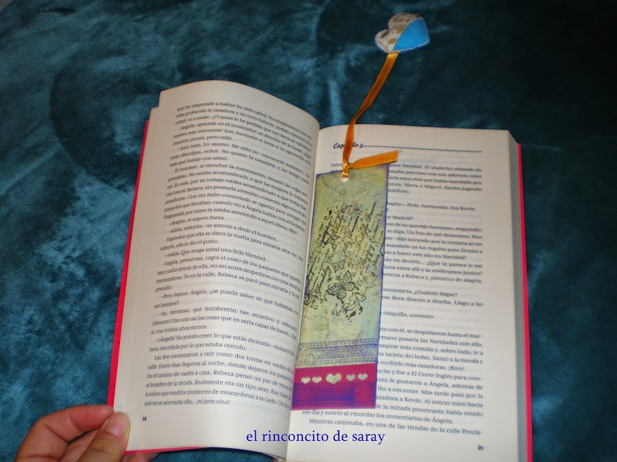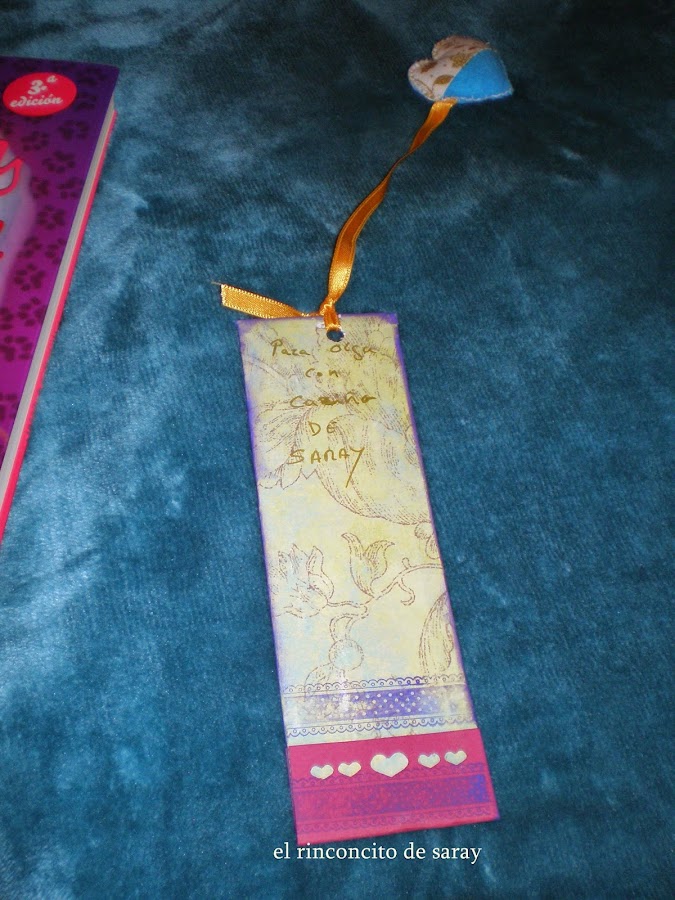 En el mes de abril se celebra el día de libro y para celebrarlo en el salón de la amistad hicimos un intercambio de marca paginas , me encanto hacer el marca paginas para mi as, según me a dicho ella le encanto y en seguida le dio uso . es un maraca paginas sencillo . utilice un trozo de cartulina fuerte la forre con un papel bonito , en otro trocito de cartulina con una troquel hice la cenefa de corazones la pegue a la parte inferior del marca paginas , le estampe una puntilla , le colgué un corazón de fieltro que hice con un toque diferente