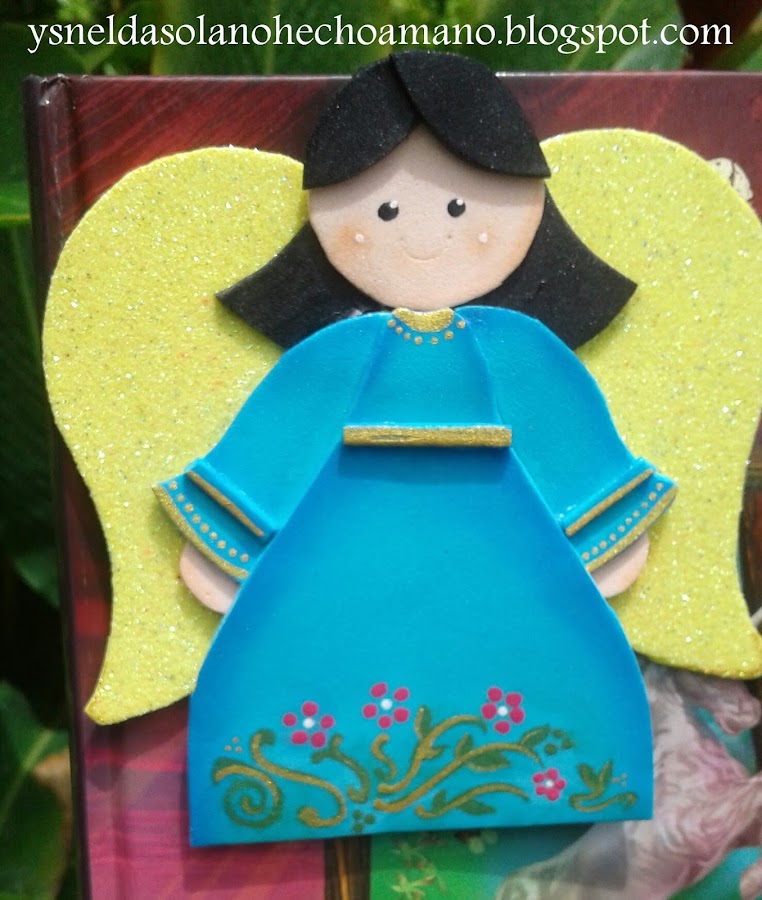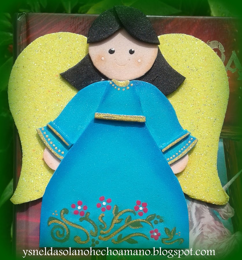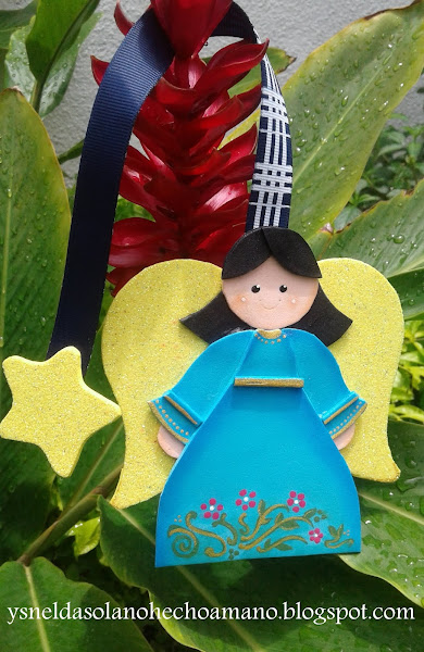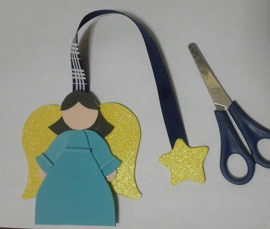 Basándome en el modelo de mi virgencita de goma eva, realicé una adaptación para realizar el angel. Y mirando en internet, consegui este decorativo modelo con cinta de tela. Vamos con los materiales: Goma eva, silicona, pedazo de cinta de tela, molde o patrón, tijeras, pinturas acrílicas y pinceles.