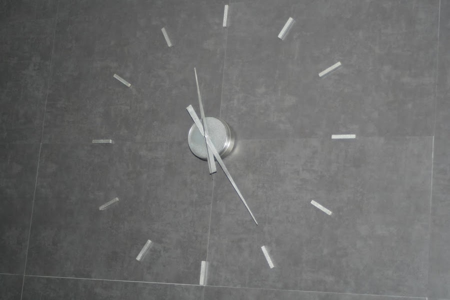 Partiendo de esta base, decidimos interpretarlo a nuestra manera, y lo primero que hicimos fue transformar los números de inglés a español. La realización de este reloj también fue de lo más sencillo. Para su construcción empleamos una bandeja Skala de Ikea , la maquinaria de un reloj Tajma de Ikea conseguido en Oportunidades, cartón negro para realizar la aguja horaria y papel pegatina transparente donde imprimir los números.