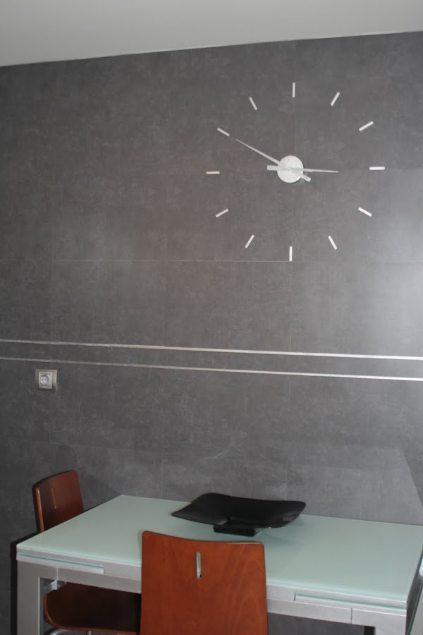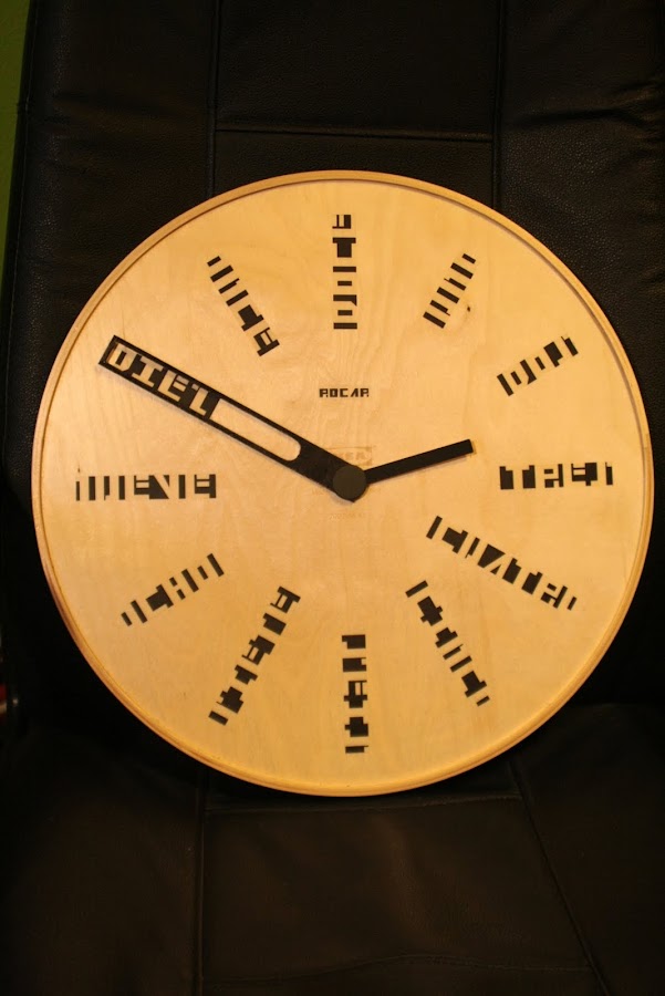 El siguiente reloj que hemos realizado ha sido el que hemos colocado en el salón. En el proceso de búsqueda de relojes, encontré uno que me llamó especialmente la atención. Se trataba del reloj Decode Clock, diseño de Arthur Yung y Clement Cheung. Su atractivo radicaba en su diseño enigmático, que aparentemente mostraba un código oculto en las señales horarias, que finalmente resultaba no ser tal enigma, ya que todo se resolvía al pasar la aguja por cada una de las horas.
